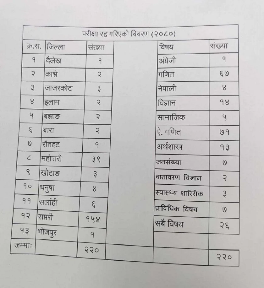 विषयगत आधारमा अङ्ग्रेजीको १, गणितको ६७, नेपालीको ४, विज्ञानको १४, सामाजिकको ५, ऐच्छिक गणितको ७१, अर्थशास्त्रको १३, जनसङ्ख्याको ७, वातावरण विज्ञानको २, स्वास्थ्य शारीरिकको ३, प्राविधिक विषयको ७ र सबै विषयको २६ जनाको परीक्षा रद्द भएको बोर्डले जनाएको छ ।