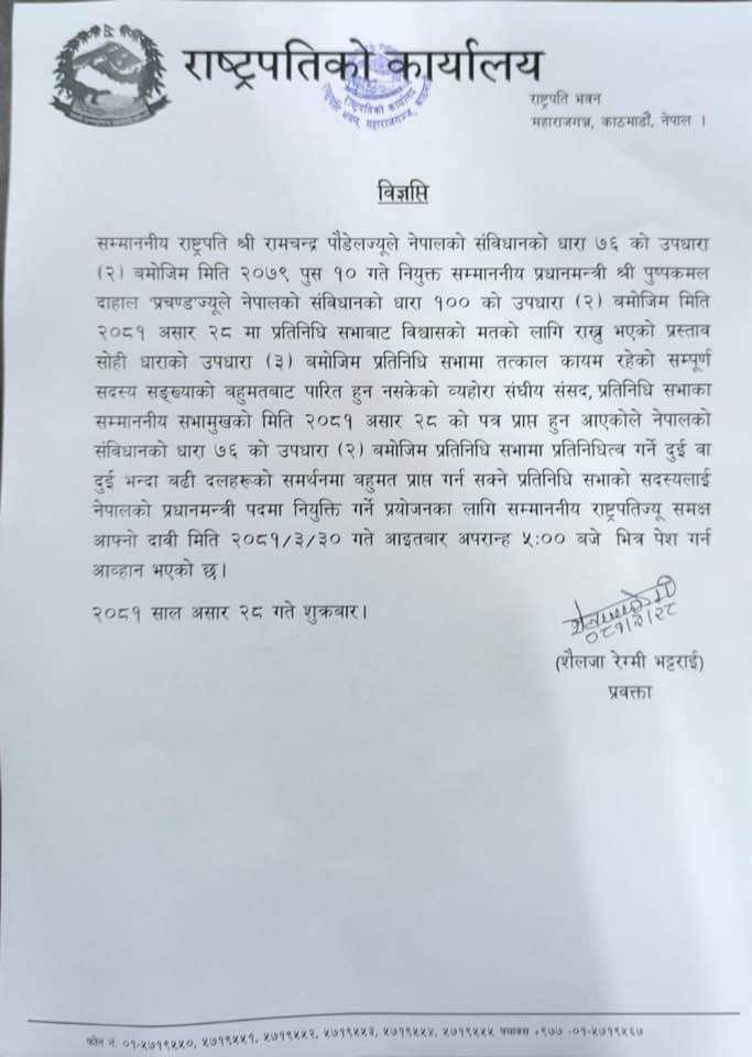 उनले असार ३० गते आइतबार बेलुका ५ बजेसम्म प्रधानमन्त्रीको दाबी गर्न दुई वा दुई भन्दा बढी दलको समर्थनमा बहुमत प्राप्त गर्नसक्ने प्रतिनिधि सभा सदस्यलाई प्रधानमन्त्रीको दाबी पेस गर्न भनेका हुन् । यसअघि उनले कानुनविद्हरूसँग राय लिएका थिए ।