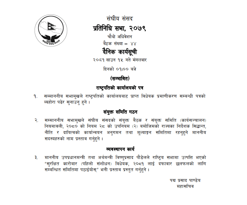 त्यस्तै उपप्रधानमन्त्री तथा अर्थमन्त्री विष्णुप्रसाद पौडेलले राष्ट्रियसभामा उत्पत्ति भएको सुरक्षित कारोबार (पहिलो संशोधन) विधेयक, २०८१ लाई दफावार छलफलका लागि सम्बन्धित समितिमा पठाउन प्रस्ताव प्रस्तुत गर्ने सम्भावित कार्यसूचीमा उल्लेख छ ।