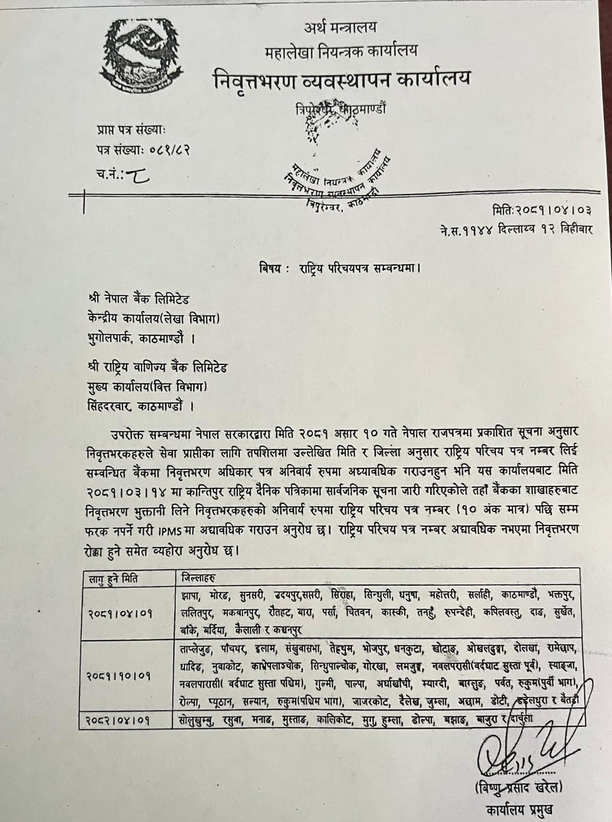 पत्राचार अनुसार साउन १ गतेदेखि २८ जिल्लामा पेन्सनका लागि राष्ट्रिय परिचयपत्र अनिवार्य गरिएको छ । ती जिल्लामा झापा, मोरङ, सुनसरी। सप्तरी, सिरहा, सिन्धुली, धनुषा, महोत्तरी, सर्लाही, काठमाडौँ, भक्तपुर, ललितपुर, मकवानपुर, रौतहट, बारा, पर्सा, चितवन, कास्की, तनहुँ, रुपन्देही, कपिलवस्तु, दाङ, सुर्खेत, बाँके, बर्दिया, कैलाली र कञ्चनपुरमा अनिवार्य गरिएको छ ।