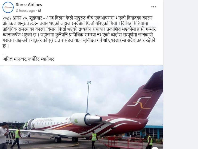 उक्त विषयबारे श्री एयरलाइन्सका प्रवक्ता, कर्पोरेट म्यानेजर अनिल मानन्धरसँग बुझ्दा आफुलाई खासै जानकारी नभएको जवाफ दिए । जबकि श्री एयरलाइन्सको फेसबुक पेजमा उनकै नाम उल्लेख गरेर यात्रुहरुबिच विवाद भएको भनेर लेखिएको छ ।