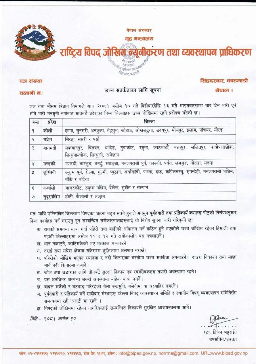 प्राधिकरणले वर्षाको उच्च जोखिम रहेका हिमाली तथा पहाडी जिल्लाहरूमा असोज ११ र १२ गते रात्रिकालीन बस नचलाउन आग्रह गरेको छ । यस्तै प्राधिकरणले धान नकाट्न र काटिसकेको भए थन्काउन पनि अनुरोध गरेको छ । पहिरोको जोखिम भएका स्थानमा र नदी किनाराका बस्तीमा उच्च सतर्कता अपनाउने आग्रह गर्दै प्राधिकरणले दाउरा निकाल्न तथा माछा मार्न नदी किनारमा नजाने पनि भनेको छ ।
