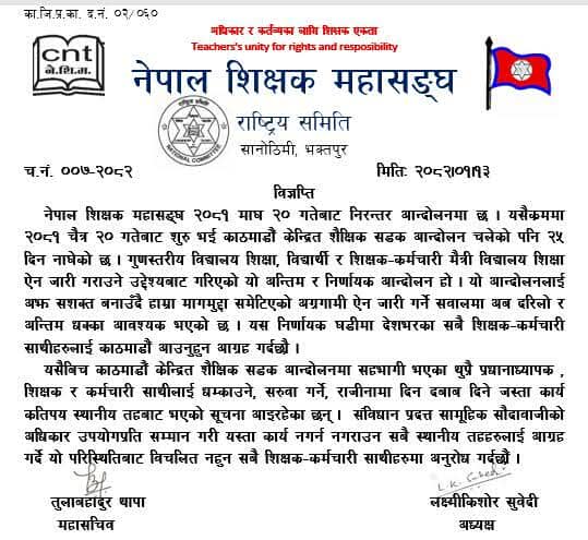 संविधान प्रदत्त सामूहिक सौदाबाजीको अधिकार उपयोगप्रति सम्मान गरी यस्ता कार्य नगर्न नगराउन सबै स्थानीय तहहरूलाई आग्रह गर्दे यो परिस्थितिबाट विचलित नहुन सबै शिक्षक-कर्मचारी साथीहरूमा अनुरोध गर्दछौँ ।’ महासंघले गत वर्षको चैत २० गतेदेखि काठमाडौँ केन्द्रित शैक्षिक सडक आन्दोलन गरिरहेको छ ।