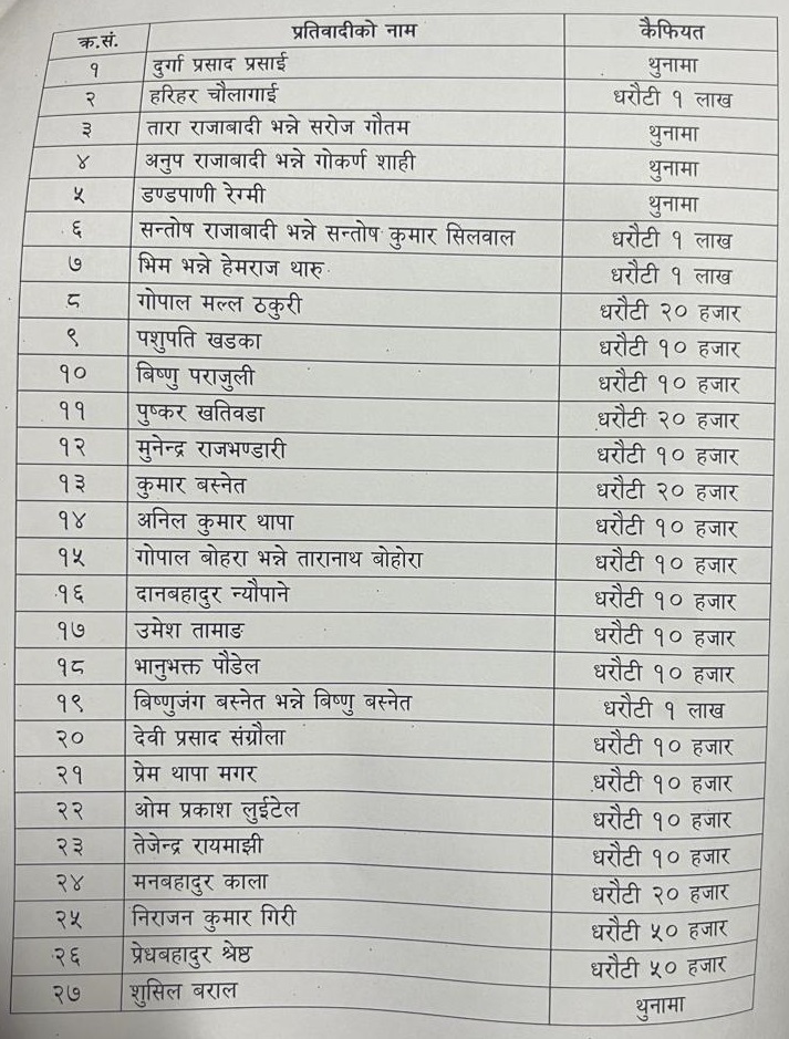 अदालतले सोही घटनामा संलग्न रहेको भन्दै पक्राउ परेका अरू ३२ जनालाई भने धरौटीमा छोड्न आदेश दिएको छ । न्यायाधीश ध्रुवराज कार्कीको एकल इजलासमा बिहीबार दिउँसो थुनछेक बहस सकिएपछि १२ः०० बजेपछाडी मध्यरातमा सो आदेश आएको हो ।