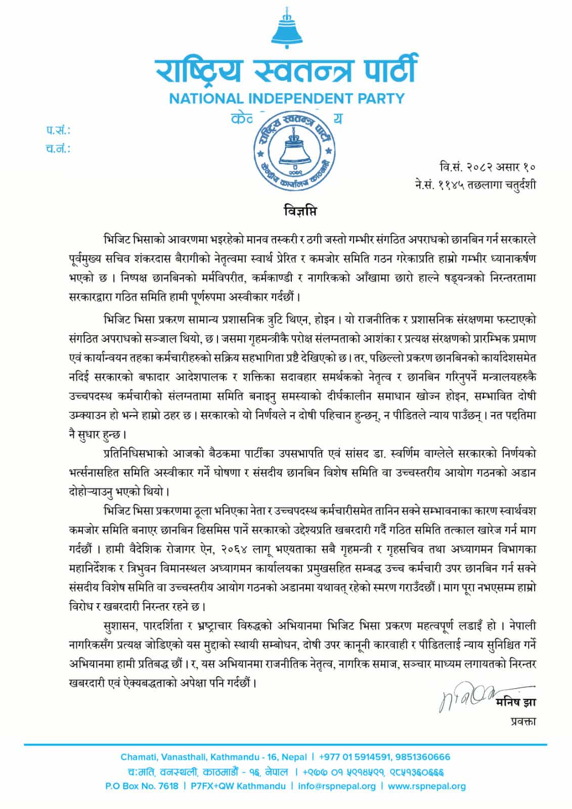 निष्पक्ष छानबिनको मर्म विपरीत, कर्मकाण्डी र नागरिकको आँखामा छारो हाल्ने षड्यन्त्रको निरन्तरतामा सरकारद्वारा गठित समिति पूर्णरुपमा अस्वीकार गरिएको रास्वपाका प्रवक्ता मनिष झाले बताए ।