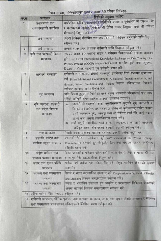 काठमाडौँ । मन्त्रिपरिषद् बैठकका १५ वटा निर्णय सार्वजनिक भएका छन् । सरकारका प्रवक्ता एवम् सञ्चार तथा सूचना प्रविधि मन्त्री पृथ्वी सुब्बा गुरुङले नियमित पत्रकार सम्मेलन गर्दै असार १३ गते बसेको मन्त्रिपरिषद् बैठकका १५ वटा निर्णय सार्वजनिक गरेका हुन् ।