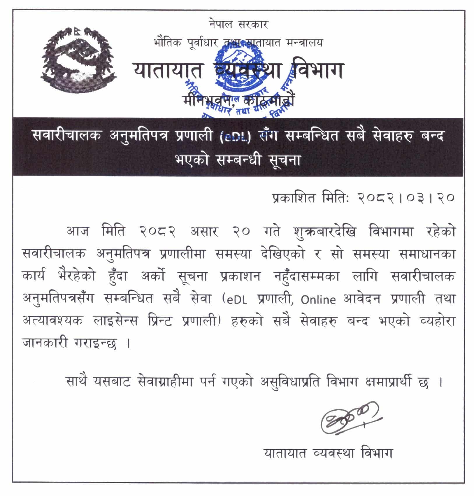 सो समस्या समाधानका कार्य भइरहेको हुँदा अर्को सूचना प्रकाशन नहुँदासम्मका लागि सवारी चालक अनुमतिपत्रसँग सम्बन्धित सबै सेवा (ईडीएल प्रणाली, अनलाइन आवेदन प्रणाली तथा अत्यावश्यक लाइसेन्स प्रिन्ट प्रणाली) हरूको सबै सेवाहरू बन्द भएको ब्यहोरा जानकारी गराइन्छ’, सूचनामा भनिएको छ । यसबाट सेवाग्राहीमा पर्न गएको असुविधाप्रति विभागले क्षमायाचना गरेको छ ।