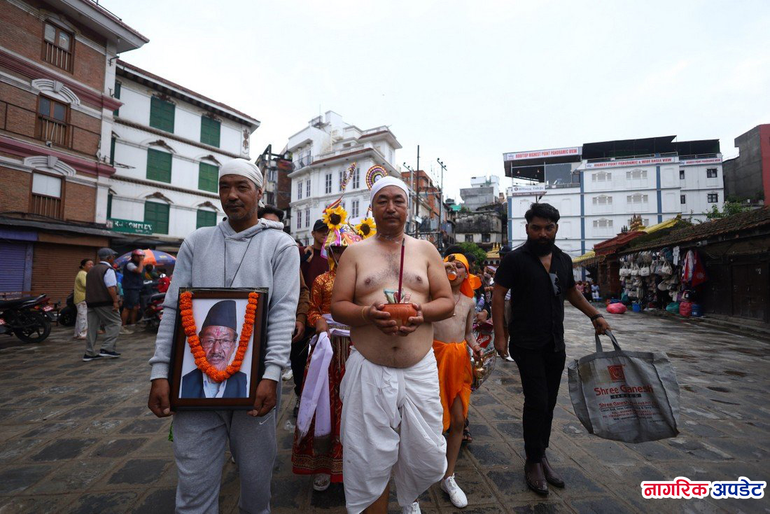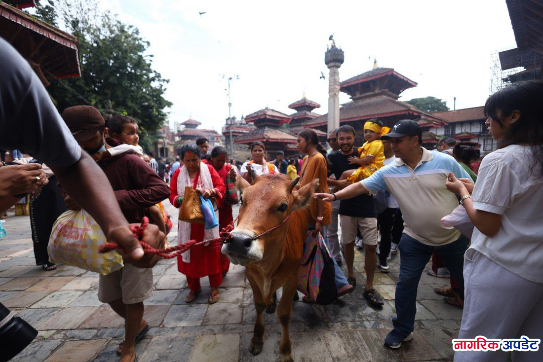 गाईजात्राको दिन, एक वर्षभित्र दिवङ्गत भएका आफन्तको सम्झनामा, गाई वा मानिसलाई गाईको रूपमा सजाएर नगर परिक्रमा गराउने परम्परा छ।