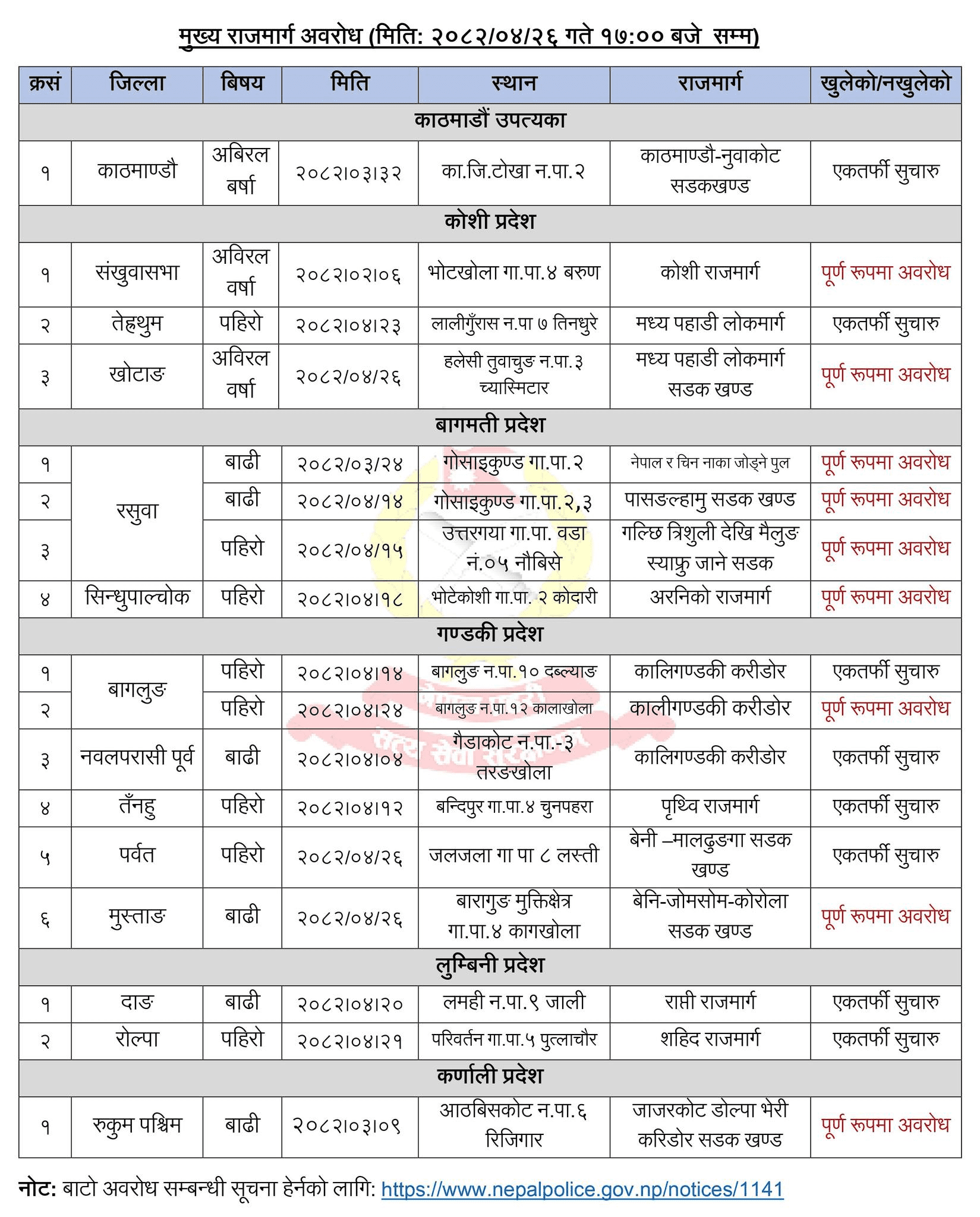 संखुवासभाको भोटखोला गाउँपालिका वडा नम्बर बरुणस्थित कोशी राजमार्ग पूर्ण रूपमा अवरुद्ध भएको छ । बागमती,गण्डकी र कर्णाली प्रदेशका सडक खण्डहरु पनि पूर्ण रूपमा अवरुद्ध भएका छन् ।